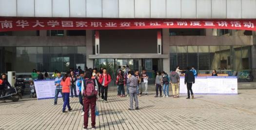 为大力推行国家职业资格证书制度,加快技能人才队伍建设,更好地服务我校学生就业和经济社会发展,贯彻执行湖南省人力资源和社会保障厅职业技能鉴定中心下发的《关于开展2015年国家职业资格证书制度宣讲活动的通知》(湘人社鉴函〔2015〕5号)文件,2015年10月11日上午继续教育华体会平台在南华大学第1教学楼前坪举办了国家职业资格证书制度宣讲活动。活动通过在校园布置宣传横幅、摆放展架、发放相关宣传资料、现场问卷调查方式进行,让学生更多的了解了国家职业资格制度。